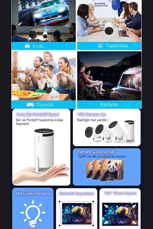 Glamarius Projeksiyon, 130” geniş görüntü boyutu ve taşınabilir tasarımıyla evinizi, bahçenizi ya da tatilinizi sinemaya çevirir. Kompakt boyutu sayesinde her yere kolayca götürebilirsiniz.